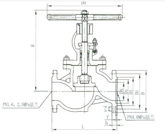 J41H铸钢法兰截止阀产品外形及结构尺寸及重量 4.0MPa